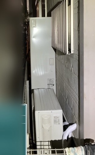 | 施工後 | パナソニック HE-WU37LQS(貯湯ユニット・ヒートポンプユニット) HE-WQWLW(リモコン) AD-HE37WGA-C(脚部カバー) |